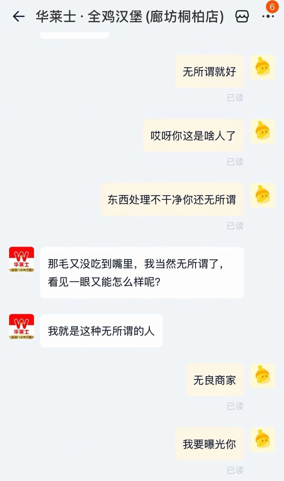 华莱士鸡块中被指吃出“白毛” 伙计回怼:毛又
